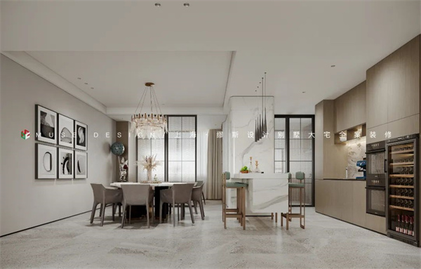 仿若碧海般沉静的绿与灵动造景折射着对生活的遐想,开放式的客餐厅开启日常生活的多重维度,细腻的基调与时尚的优雅共存,在流转的光影下演绎着日常的高级精致感。